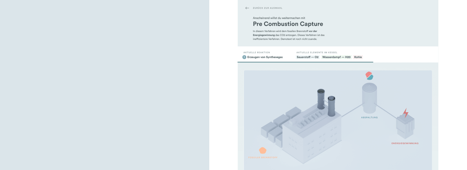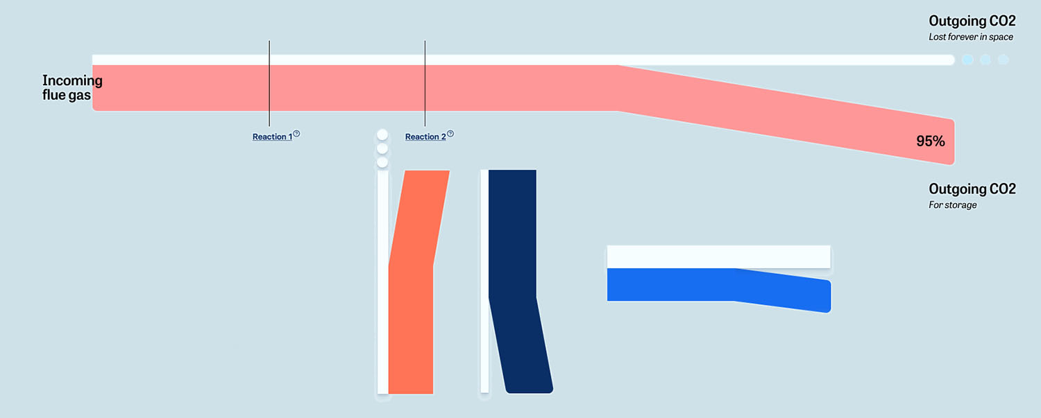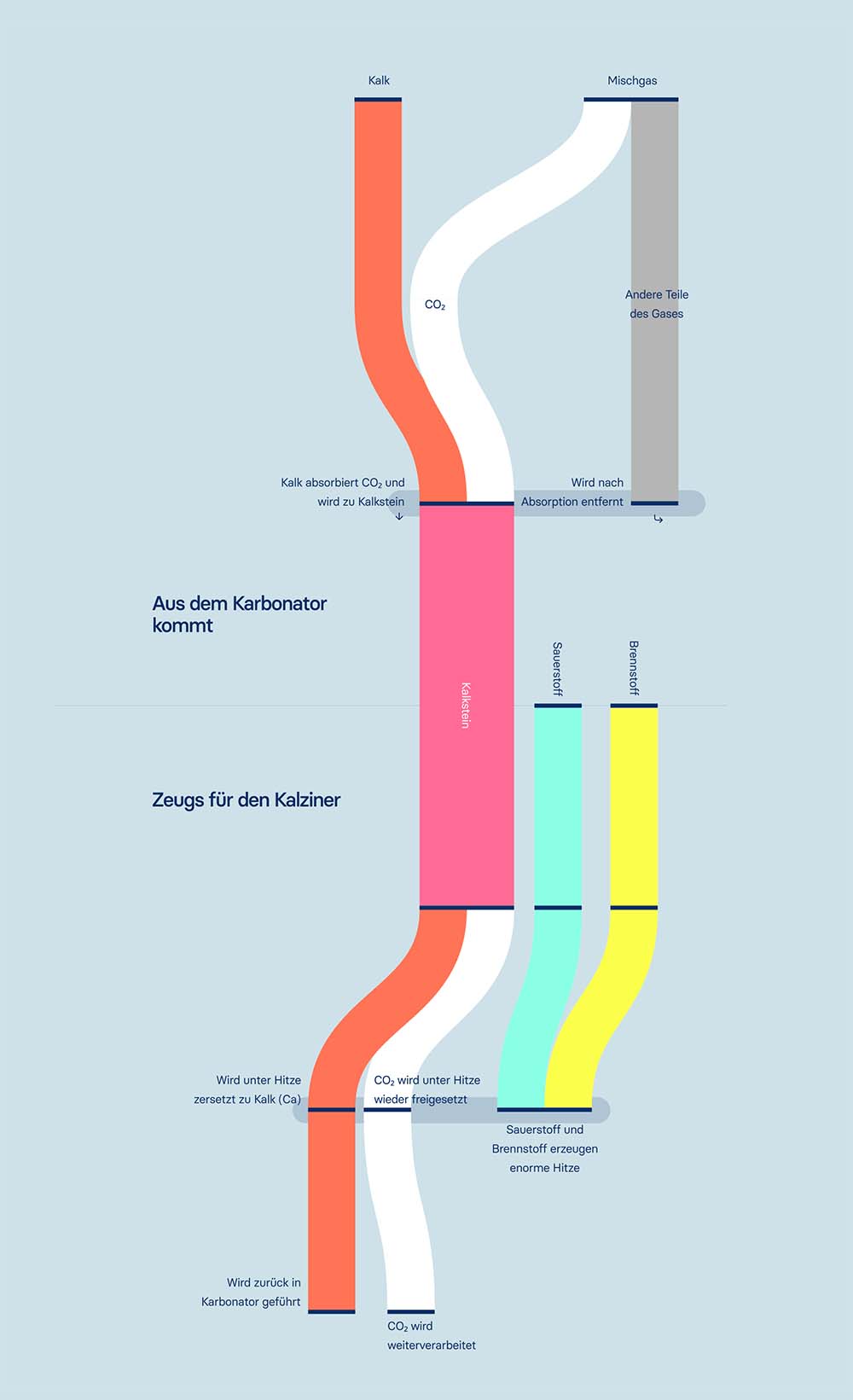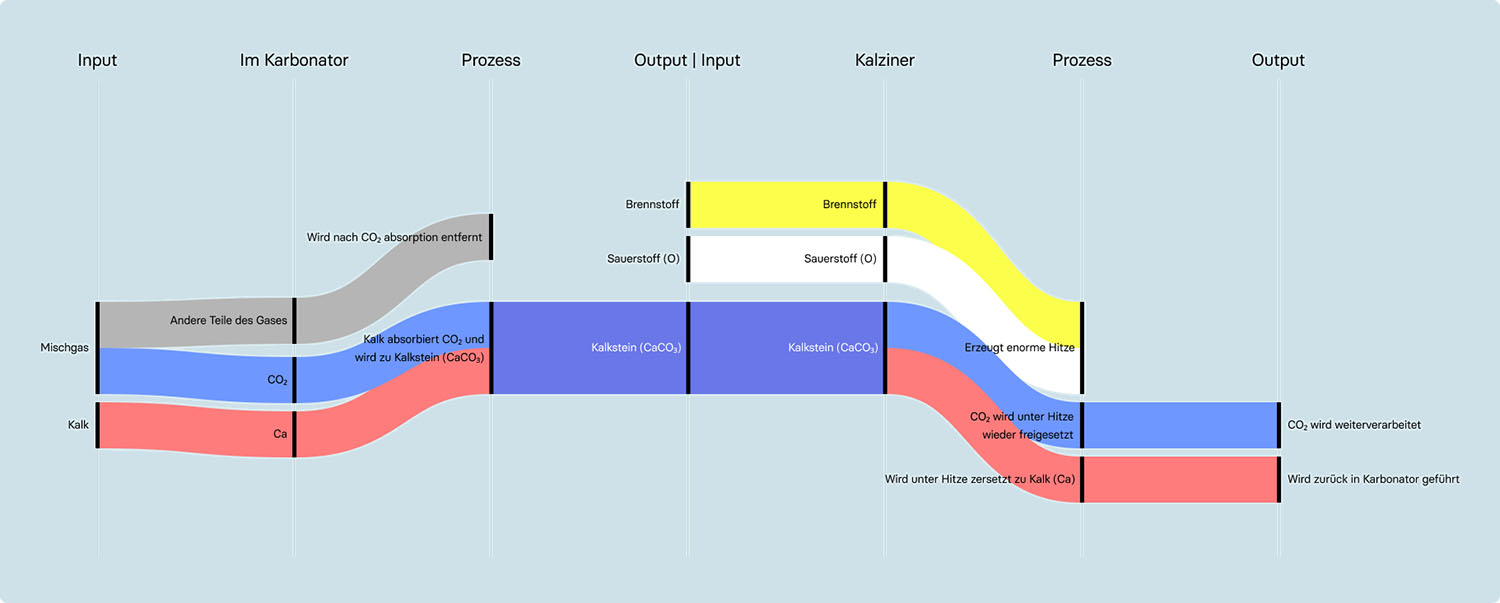 Here we decided on a presentation visually based on Sankey diagrams. A sequence is shown in which the individual components can be followed as they change during chemical or physical reactions. CO₂ is always visualized in white, allowing the viewer to recognize and follow its course throughout the process.