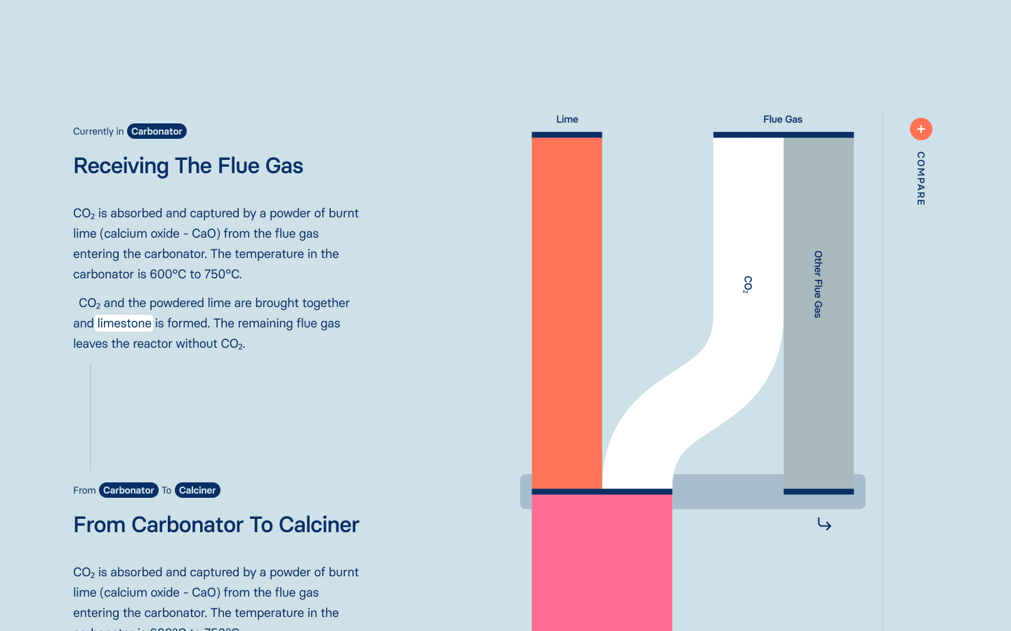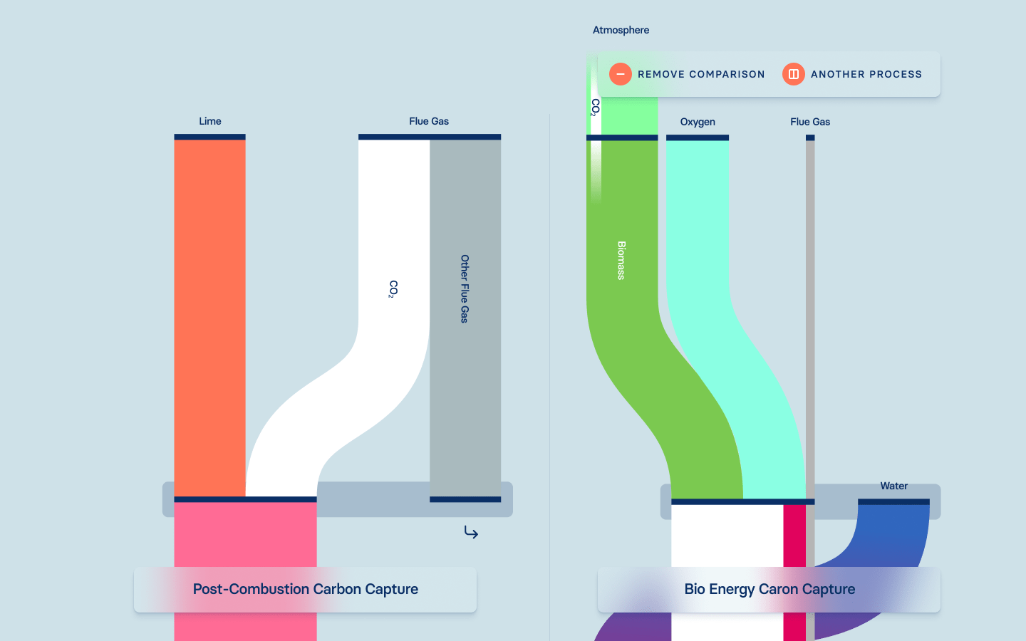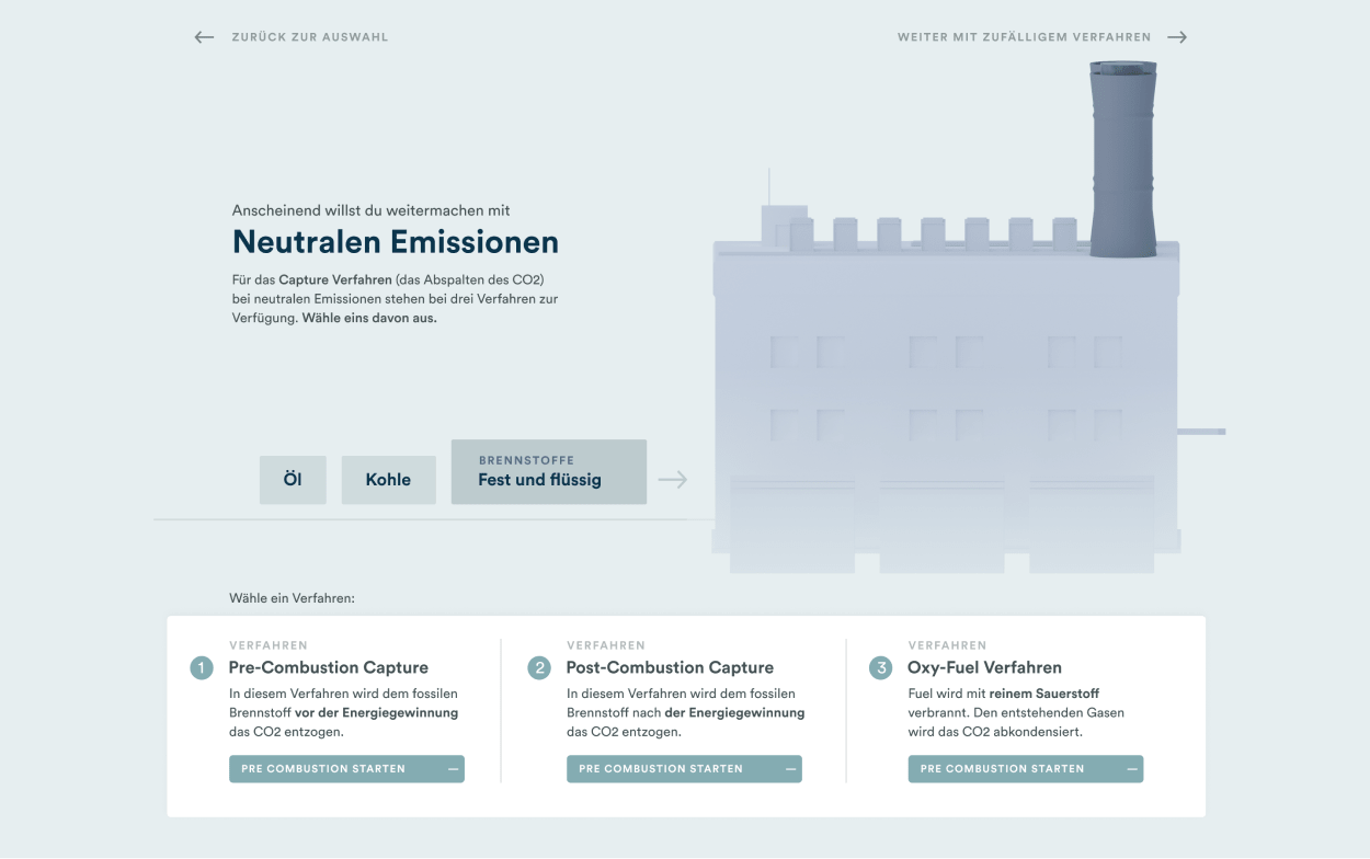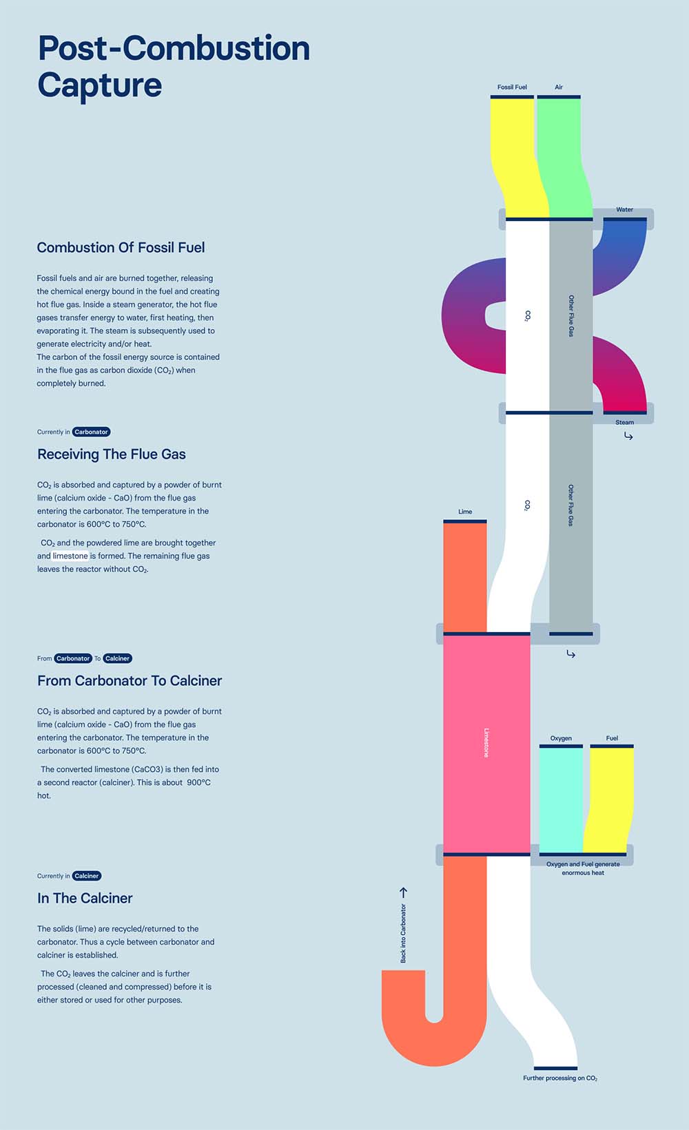 Here we decided on a presentation visually based on Sankey diagrams. A sequence is shown in which the individual components can be followed as they change during chemical or physical reactions. CO₂ is always visualized in white, allowing the viewer to recognize and follow its course throughout the process.